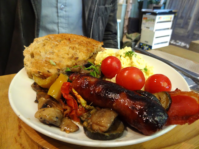 It was technically lunch time, but when we saw the breakfast menu there was no going back. I went for the pancakes with bacon, sausage, berries & maple syrup, and E chose the granary toast with bacon, sausage, vegetables & scrambled eggs.